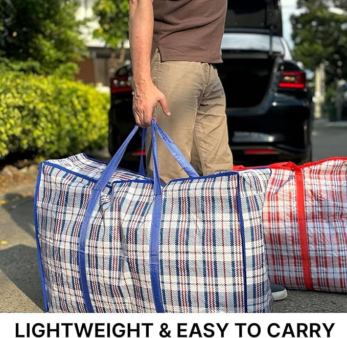 Upgrade your storage with LE11 Extra Large Jumbo Storage Bags, perfect for bedding, clothes, duvets, and more. Made from durable, tear-resistant, waterproof woven polypropylene, these reusable bags feature a secure zip closure and are ideal for home storage, laundry, moving, and travel. Each bag measures 80 x 85 x 25 CM and is easy to clean and fold. A practical, eco-friendly solution to organise your space. Pack includes 5 bags.